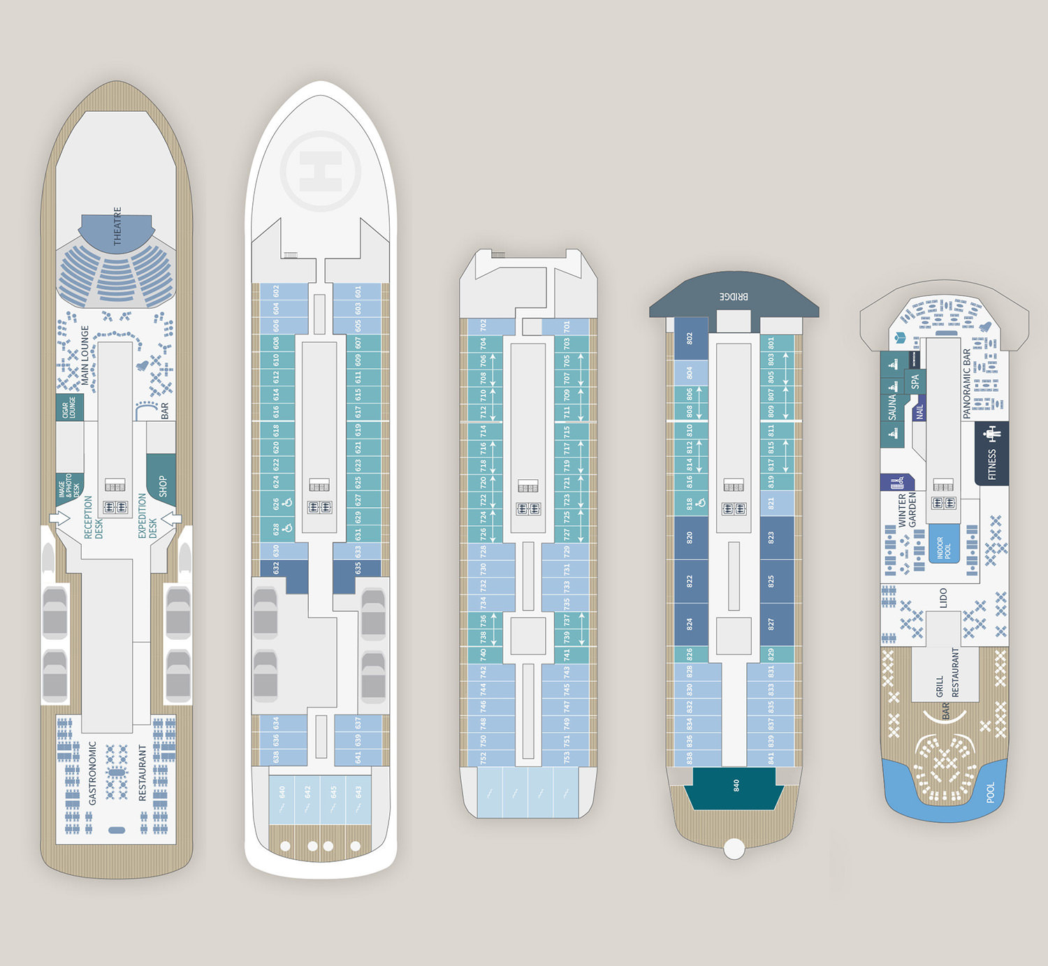 Charcot’s interiors are every bit as memorable as the landscapes outside. You’ll relax in spacious lounges, retreat to the elegant Cigar Lounge, browse travel and exploration books in Anori, the library within the panoramic lounge, or gather in Kita, the theater, for performances, briefings, and lectures led by naturalists, experts, and distinguished guests.