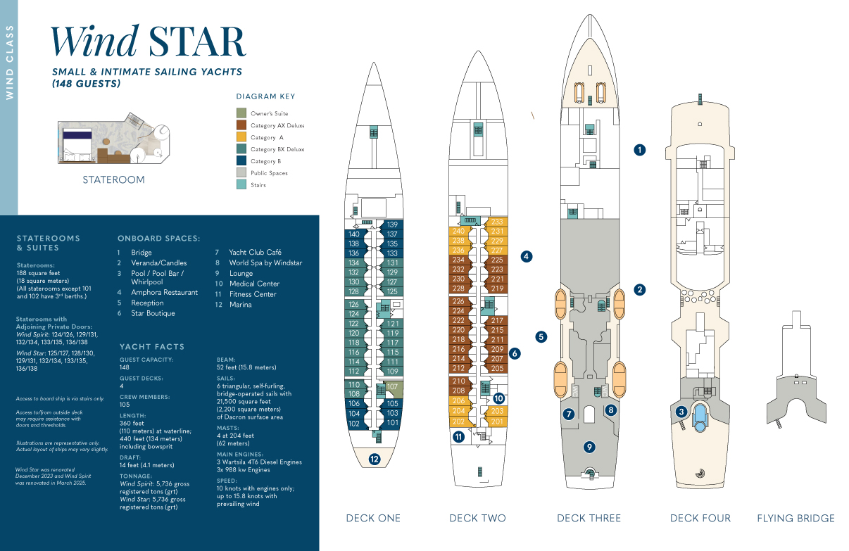 The Wind Star, the sister ship of the Wind Spirit, will be fully renovated in 2027. It is a four-masted sailing yacht with four decks. It accommodates 140 guests, so the Wind Star feels like your own private yacht.